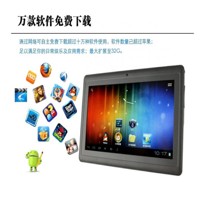 智能平板电脑(4G/8GB) 操作系统 Android4.0 处理器型号 ARM Cortex A8 芯片方案 全志A13 系统内存 512MB DDR3缓存 ...