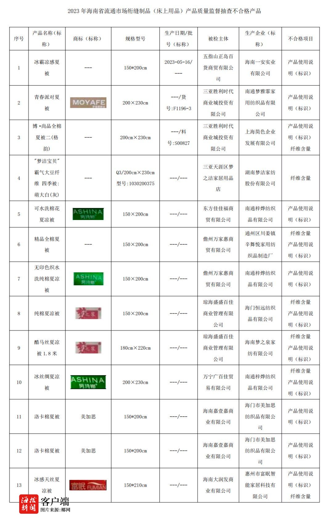 据统计,13批次不合格绗缝制品(床上用品)产品为冰霸凉感夏被、青春派对夏被、博·尚品全棉夏被二(格韵)、“梦洁宝贝”霸气大豆纤维四季被:萌大白(灰)、可水洗棉花夏凉被、精品全棉夏被、无印色织水洗纯棉夏凉被、纯棉夏凉被、酷马丝夏凉被、冰丝绸夏凉被、美加思洛卡棉夏被、冰感天丝夏凉被等,分别由五指山正岛百货商贸有限公司、三亚胜利时代商业城投资有限公司(2批次)、三亚天涯区梦之洁家居用品店、东方佳佳福商贸有限公司、儋州万家惠商贸有限公司(2批次)、琼海盛盛百佳商业管理有限公司(2批次)、万宁广百佳贸易有限公司、海南嘉壹嘉商业有限公司(2批次)、海南大润发商业有限公司等9家商超销售,由海南一安实业有限公司、南通梦雅霏家用纺织品有限公司、上海简色企业发展有限公司、湖南梦洁家纺股份有限公司、南通梓烨纺织品有限公司(3批次)、通州区川姜镇辛舞悦家用纺织品制造厂、海门恒远纺织品有限公司、海南梦之泉家纺有限公司、海门市美加思纺织品有限公司(2批次)、惠州市富眠智能家居科技有限公司等10家企业生产。