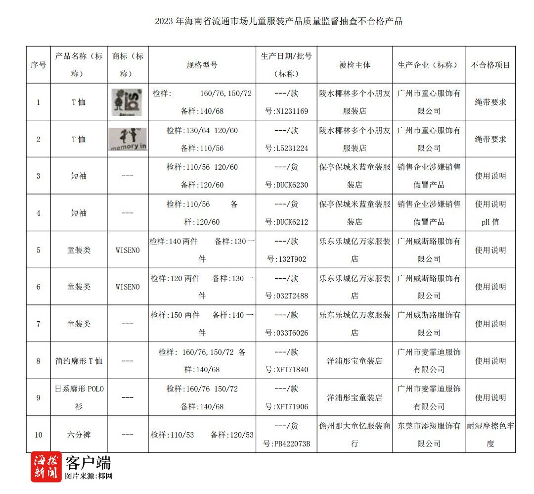 据统计,10批次不合格儿童服装产品为T恤、短袖、童装类、简约廓形T恤、日系廓形POLO衫、六分裤等,分别在陵水椰林多家小朋友服装店(2批次)、保亭保城米蓝童装服装店(2批次)、乐东乐城亿万家服装店(3批次)、洋浦彤宝童装店(2批次)、儋州那大童忆服装商行等5家服装店销售,广州市童心服饰有限公司(2批次)、广州威斯路服饰有限公司(3批次)、广州市麦霏迪服饰有限公司(2批次)、东莞市添翔服饰有限公司等公司生产。